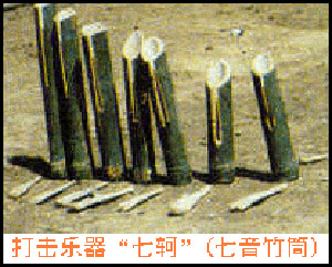 “七轲”又称“七音竹筒”,是基诺族民间流行的打击乐器,竹筒本是基诺人民盛水和饮酒的器物,人们在狩猎丰收庆贺时便敲打竹筒以娱乐,后来就发展成为用7个长短不同的竹筒制成的狩猎专用乐器——“七轲”。当基诺猎手捕获到大野兽时,他便吹响“杓北”发出信号,村里的群众闻讯赶到现场,砍来竹筒做成七轲,欢快的人们一边敲着七轲,一边将猎获的野兽抬回村寨。现今流行的七轲,制作工艺已比较考究,从竹子的选料、砍伐的季节到竹筒的长短粗细,削制的形状,开槽的深浅,音高的调试等,都有了较为严格的要求。组成七轲的竹筒音高不同,并且还有专名称谓,其中3个竹筒用来演奏旋律,另外4个则作为伴奏,演奏可由3—7人配合进行,音色古朴优雅,别具特色。