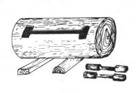 佤族的木鼓,佤语称库洛、克拉,是用一整段粗大的原木制成,多采用红毛树、椿树或樱桃 树等硬质的树干下部为材。传统的木鼓,形体粗大,一般长150厘米~250厘米,较大者可达 300厘米~400厘米,粗端直径50厘米~100厘米,较粗者可达150厘米。在原木中部纵向挖一狭长音孔, 距两端各20厘米,中间狭窄处孔宽6厘米,两端较宽10厘米~12厘米。音孔由两端向中间挖成两头浅、中间深的鼓腹。木鼓外表有的剥去树皮,一般通体光滑无饰,有的则在一端雕刻出牛头或人头形,也有的通体刻以三角纹或斜纹等图案为饰。云南省西盟佤族自治县文化馆收藏的一个木鼓,鼓长155厘米、粗端直径50厘米、音孔长110厘米、宽10厘米。成对的佤族木鼓,虽外形和构造相同,但选材、大小和音响有别。稍大的母木鼓,多用马老鹰树制作,发音较低而沉重;略小的公木鼓,常用红毛树制作,发音较高而明亮。20世纪80年代以来,云南省西盟、沧源、澜沧等县的文工队,将木鼓加以改革,出现了长125厘米、粗端直径35厘米的小型木鼓(图)。在原木中部挖一条两头宽、中间窄的音孔,音孔的两头留有对称的称为鼓舌的木墙,由两端往下挖出两头浅、中间深的鼓腹。因鼓舌厚度和鼓腹深浅的差别, 敲击木鼓的不同部位,每个木鼓都能发出两个音高不同的音响,音程相距为大三度或四度。木鼓常置于两块木板或两个石块上,使其离开地面有利振动发音。