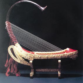 凤首箜篌是缅甸古乐器的一种,远在千余年前就已传入我国,在敦煌千佛洞壁画中,绘有凤首一弦琴,一天女抱而坐弹,似此种乐器。近年来华访问演出的缅甸文艺团体,其乐器就有凤首箜篌,古乐相承,至今不断。 这件箜篌,是在优质的木胎上,涂上金漆,在闪耀着金色宝光的舟形琴盘上,伸着一条孔雀细颈般的弯弯的琴首,优雅自然,上面像鼓满的风帆一样,张起14条琴弦,演奏者用指尖弹出梦乡一般的幽雅琴曲。该乐器造型优美,色彩华丽,工艺精湛,作为高贵的礼品,既展示了缅甸艺人的高超技艺,又意味着中缅友谊源远流长。