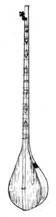 〔中音东布拉〕琴体较阿肯东布拉稍大,全长95厘米~100厘米。共鸣箱较大,面宽20厘米~22厘米。琴头竖置两轴,琴杆嵌有13个~17个音品。张两条丝弦(图),按四度或五度定弦:d、g或d、a,比高音东布拉低一个八度。音域d—d2或d—e2。用手指弹奏,音色柔和,可用于独奏、合奏或伴奏,是乐队中重要的旋律乐器。1980年,上海民族乐器一厂研制成功电中音东布拉,音响洪亮浑厚,音色柔润动听,已用于独奏、合奏或歌舞伴奏中,收到较好的艺术效果。