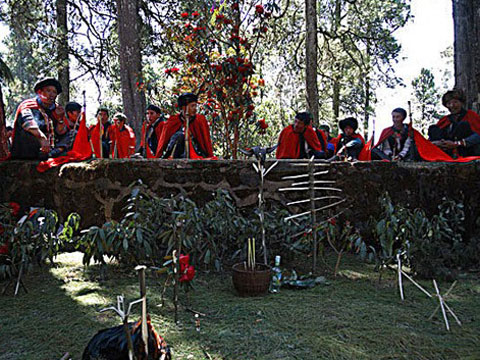 在婚礼的头一天彝家人就要把“唢呐匠”请到新郎家来。“唢呐匠”在离新郎家还有一段距离时就要停步,等到天黑的时候才开始发“过山号”,新郎就要端着装有红布,白米,茶酒糖果的盘子来迎接。过山号明早即将娶妻的新郎我们在这为你发号告知你四面八方的亲朋好友你已万事准备齐全就等我们为你来暖屋还望新郎出门迎我进彝家婚礼中的“过山号”是用大芒筒和大巴拉来吹奏的。大芒筒和大巴拉一般为1