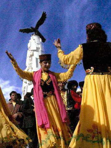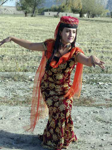 导语:   塔吉克族是中国古老的民族之一,主要聚居在新疆塔什库尔干塔吉克自治县,其余则分布在该县以东的莎车、叶城、泽普等县。坚韧不拔的意志和一往无前的大无畏民族精神逐渐形成了塔吉克民族特殊的审美追求。他们视鹰为强者、英雄,在民间广布有关鹰的民歌和传说,甚至连舞蹈的起源都与鹰的习性、动态联系在一起,于是形成了“鹰舞”。   鹰舞是塔吉克族的民间传统自娱性舞蹈,场地不受限制。无论田埂地头、庭院室内,只要人们兴致所至都可起舞。其舞步与鹰笛的曲调是一致的,主要是八分之五拍、八分之六拍、八分之七拍,基本动作是:腰微弯,右臂朝前伸,手指微朝上,左臂弯曲朝后,位于腰部,手指伸开。脚步随着笛声和鼓点旋转360度,此时,收回右臂放在背后,伸出左臂朝前。有时两臂平行,有时两臂一上一下,恰似鹰的翅膀,脚步随鼓点和笛声可旋转180度和360度,也可朝前和左右前进。无论在旋转或是在前进时,两肩还要随着曲调的节奏不停地一上一下地抖动。鹰舞主要是男人的舞蹈,但也有男女合跳的,也有集体跳的,遇到节日或是婚礼,只要是鹰笛和手鼓声一响