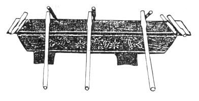 用龙眼木、榨木等整段坚硬原木挖制而成,外形为一长方形敞口木槽(图)。槽长200厘米、宽40厘米、高35厘米、槽壁厚6厘米,槽口朝上,槽下两端支有木制或铁制脚架。砻体做工精致,槽壁外侧还绘以各种花卉和图案纹饰。使用木制击棒撞击,每根击棒长150厘米,外形与乐杵有些相像,两端较粗,中间手握部分较细,直径只有5厘米。