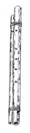 管身竹制,由主、副两管并列绑扎而成(图)。主管较粗、副管稍细,均用无节竹管制作。管长30 厘米左右,上端管口即为吹口,口内堵以斜形木塞,在管身背面木塞斜口的下方,各开一个方形发音孔。主管开有六个(前五后一)圆形按音孔,副管不开按音孔,只发一音。主、副管上、下两端用丝线捆紧,外涂黄蜡固定。