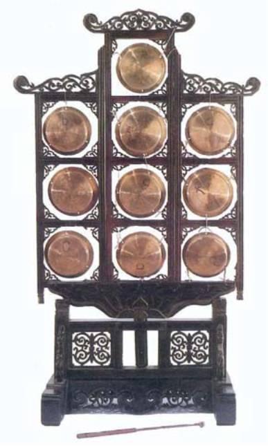 我们的祖先很早就将音高不同的小铜锣编排起来,用于音乐实践中。宋代画家苏汉臣的《货郎图》中,一 货郎身挂数件乐器,其中有一件为十面云锣,可知早在宋代民间已有云锣流传和使用了。六百多年前的元代,云锣不仅在民间流行,并且在宫廷宴乐中使用,当时称为云墩,《元史·礼乐志》“宴乐之器"中有:"云墩,制以铜,为小锣十三,同一木架,下有长柄,左手持,而右手以小槌击之。"这也是见于文献的最早记载。元代云锣还用于宗教音乐中,如在山西芮县永乐镇的永乐宫元代壁画《奏乐图》和三清殿斗拱间的装饰画中,均画有演奏云锣的图像,宫中壁画反映的是道教生活,表明云锣早期已用于道教音乐。元代的史籍和壁画看来,就有十、十三和十四音云锣。清代前期,云锣曾发展到二十四音, 《扬州画舫录》记载着在福建地区曾流行过十四音云锣。据《清史稿》载,云锣在清代宫廷音乐中已广泛用于御前仪仗乐、丹陛大乐、中和清乐、导引乐、铙歌及铙歌清乐、凯歌、庆神欢乐、赐宴乐等。清代曾有《云锣谱》传世,由著名京剧表演艺术家梅兰芳先生收藏,梅先生在《太真外传》一出戏中用过云锣。《云锣谱》后由梅先生赠予好友宋先生。该《谱》详尽地介绍了云锣的音律和每面云锣的规格尺寸。