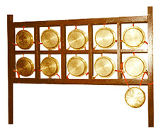 云锣由锣体、锣架和锣棰组成。云锣由大小相同,而厚度,音高存在区别的若干铜制小锣组成。这些小锣以音乐次序悬挂于木架上,每一个小锣都由3根绳吊在木架的方框中。云锣的演奏方法与中国锣类似,用小槌击奏,其常见编制为十个一组,也有十四个一组和二十四个一组的大型云锣。
