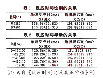 1.性别与年龄因素。有实验表明,男性重复动作比女性快捷(基于单纯反映时),而应变反应能力男女相同(基于选择反映时)(如表1);而年龄方面呈现年龄越小重复动作越快捷,39岁以前年龄越大则应变反应能力越强的特点(如表2)。另外的研究结果为听觉反应时随年龄的增长而缩短,在7至21岁不同阶段的人差异很显著(p<0.01)②。