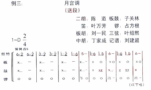 《月宫调》⑩(如例三)是道教乐曲代表性的曲目,当地民间艺人称它为古典乐曲,为何缘故?原因有三:一是《月宫调》既可用于道教场合,又可适用于佛教场合;二是《月宫调》由唐代法师叶法善所传,并代代相传,从古至今传承极为严格;三是《月宫调》为当地道教乐曲的母调,一切道教乐曲均与《月宫调》有渊源关系。故民间艺人视《月宫调》为珍宝,既称之为古典乐曲,又称之为道教乐曲。