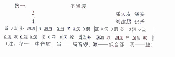 清锣鼓有独奏和合奏两种形式。独奏的清锣鼓,由三面造型一致,但大小、音高不同,均用金属铜制造的锣加一大鼓组成,由1人演奏,用于喜庆场面,表示吉祥如意。如少用一面锣,则作用相反。这种独奏形式的清锣鼓,其演奏形式、乐曲进行的速度、旋法等自古以来相沿成习,均保持传统的模型;其曲调进行稳健,恰似铜钟鸣响;大鼓的演奏,可稍加花,但仍保持节奏的统一。如例一《冬当渡》。③