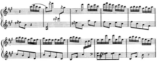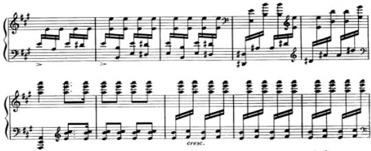 2例如在快速的十六分音符后衔接双手快速八度交替,这便会使整个手臂、手腕、手指僵硬,并有可能使身体受到伤害。
