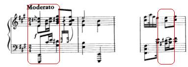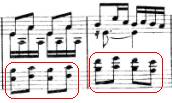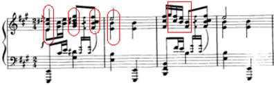 谱例13:1(椭圆形为近距离级进,正方形为省略低音的音程或单音,下方则是低声部纯五度近距离连接)