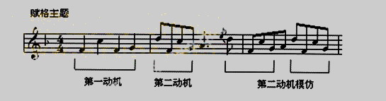 旋律中纯五声骨干音之间的跳跃使曲调听起来淳朴自然;上方声部的八度加花支声性手法的采用,又使旋律音响效果丰富而饱满;而在旋律中出现的第二动机的三次重复,并没有使旋律单调乏味,相反由于每次重复都移动了节奏重音(见赋格主题谱例),所以使旋律在平淡中又透露出几分精致,真是妙趣横生。