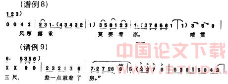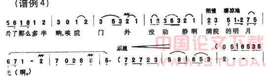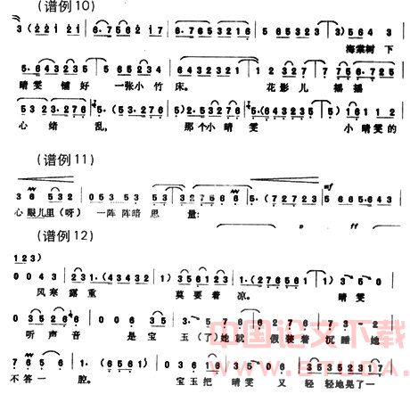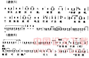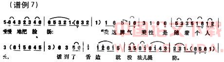 “我这脾气秉性是随着个人长……至……肚子里没有病装的可是什么样儿的恙”;这七个上下乐句,有长言,有短句,前三乐句是晴雯以自嘲、斥俗、倔强的口吻志端意明地宣告了自己的志向。唱腔上下句由“商”至“宫”“宫”至“角”“徵”至“宫”;后四句“宫”至“羽”“徵”至“宫”“宫”至“羽”“商”至“徵”。