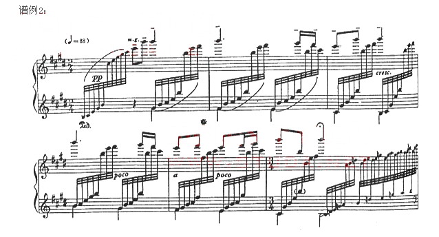 中国音乐之优点在于其悠远的内在神韵。神韵是决定音乐风格特征的决定因素。“以韵传神”,即表现乐曲的内在神韵,是演奏中国传统音乐时体现民族音乐精神的内核。“韵,是一种总体上令人回味的感觉”,“它建立在技巧与作品内容、风格的高度统一上。中国传统音乐的神韵主要体现在旋律的线性美及音色与‘音势’的丰富变化上。”②由古曲改编的钢琴作品《梅花三弄》主题的第三次出现(见谱例2),就继承了这一特点。作品跌宕起伏、委婉流畅的旋律,虚实相间、刚柔相济的音色,抑扬顿挫、轻重缓急的音势,整合在一起蕴含了一种特殊的韵味,准确地表现出作品的艺术美。
