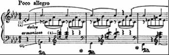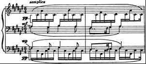 而李斯特的《爱之梦》之三。其中四个声部的层次分明。演奏时必须将四种触键全用上:主旋律用全臂触键;低音的对位旋律用臂落触键;高音和弦用手力触键;分解和弦用指力触键。如例4