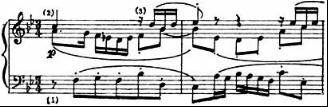 此处低声部的主要主题最重要。而中声部的对题(2)和竞相出现的、闪现在高声部的短小音型(3)应处于陪衬的地位。