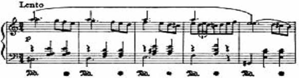 在此,高声部的持续A音应当用全臂触键弹,低音用臂落触键弹,而流动的旋律和伴奏和弦则用手力触键弹。