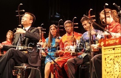 10月初,身着中国传统服装的美国加州大学洛杉矶分校学生操二胡、扬琴等中国乐器,与来自上海交通大学的陈飞教授一起同台演出。据在加州大学洛杉矶分校任教的中国音乐教授介绍,中国音乐与乐器受到越来越多的美国学生喜爱。