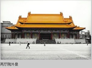 就像上海有上海大剧院一样,台北有个“两厅院”。两厅院也是一个演出机构,由戏剧厅和音乐厅两个厅合成的一个院,正式名称是中正文化中心。台湾最重要的演出都在这里上演。由于建筑上采用中华民族传统的金色琉璃瓦大屋檐的造型,两厅院常作为旅游景点供旅行社带领外来游客参观。