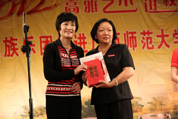 5月7日晚7:30,“中央民族乐团走进广西师范大学专场音乐会”在桂林师大王城大礼堂精彩上演。该音乐会是中央民族乐团2012高雅艺术进校园之桂林专场演出的第一站,广西师大党委书记王枬、党委副书记唐仁郭、副校长刘健斌、白晓军、蔡昌卓,桂电大学党委副书记覃干超、王赣华,桂林医学院党委书记仇小强、副书记齐俊斌,桂林旅游高等专科学校党委书记林娜、副书记蒋伟、吴江萍,漓江学院党委副书记李雨,山水职业学院党委书记苏旭南、副院长汤齐宗等桂林各大高校领导出席并观看了音乐会。