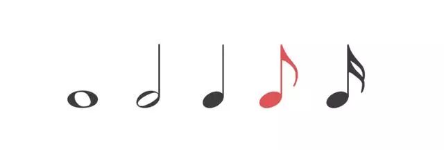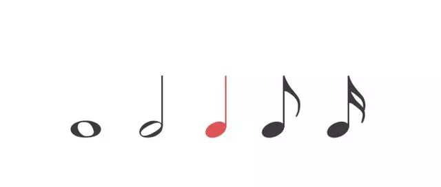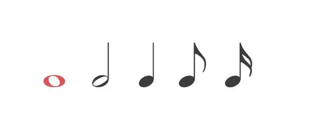 一个音符的持续时间叫做音长,或者称为音符时值,音符的类型决定了音符的时值。下图中有一些不同类型的音符,它们从左至右的名字分别为:全音符、二分音符、四分音符、八分音符、十六分音符。